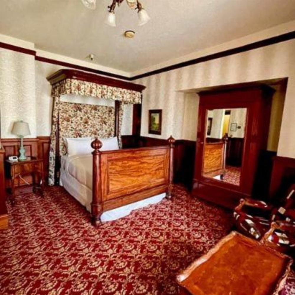 This charming deluxe room has a luxuriously dressed queen-size bed and a seating area featuring exquisite antique furniture alongside modern day amenities.